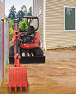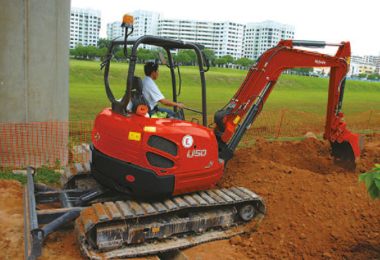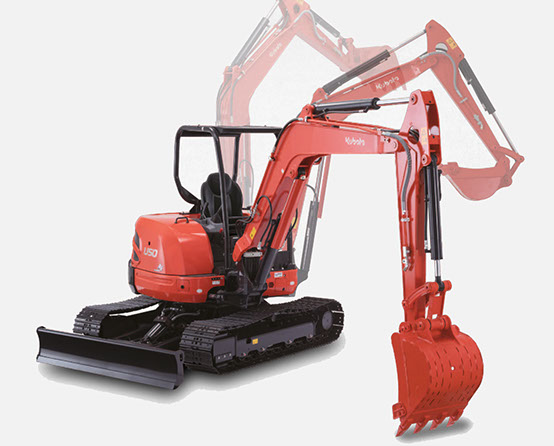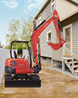 Kubota's boom-swing allows direct digging close to a wall or building without repositioning the mini-excavator.