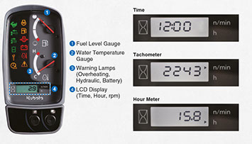 The user-friendly digital panel features one-touch button operation to view the time, hour meter and tachometer.
