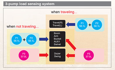 Kubota’s improved 3-pump load sensing hydraulic system ensures smoother operation, regardless of load size. It allows hydraulic oil to flow according to the specific range of the operator’s lever motion. The result is greater fuel economy and smoother traveling
