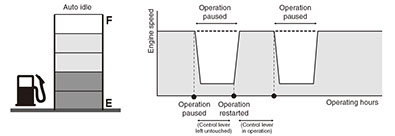Kubota’s Auto Idle system helps save up to 10% fuel. When the control levers are in neutral for more than four seconds, the engine idles automatically. Move any control lever and the engine immediately engages. This innovative feature reduces noise, exhaust emissions and running costs.