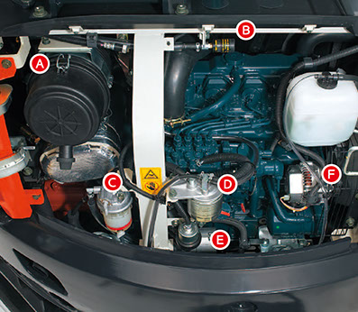 Kubota has made routine maintenance extremely simple by consolidating primary engine components onto one side for easier access. Engine and other vital components can be inspected quickly and easily.